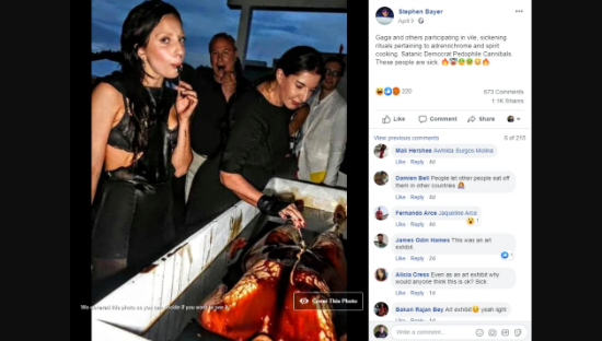 Esta foto de Lady Gaga es común en los threads de adrenocromo. En realidad es una obra de arte interactivo de la artista Marina Abramovic (2013)