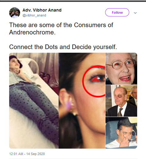 Y ya en 2020 y con los efectos de la pandemia de Covid-19, muchas de las celebridades que publicaban fotos de ellas mismas atrapadas en casa y que parecían agotadas o tristes fueron asediadas en las redes sociales con acusaciones de que sufrían abstinencia de adrenocromo. El rumor de que Lady Gaga estaba participando en rituales de sangre para obtener adrenocromo fue incluso bastante popular entonces.