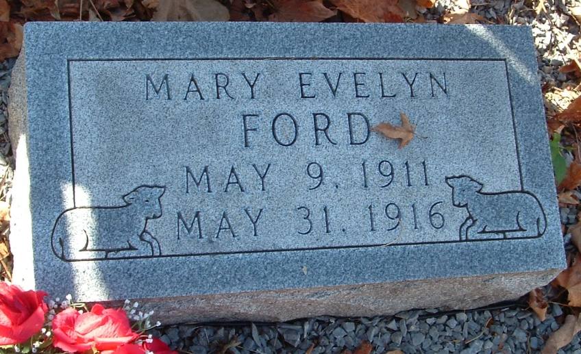 La historia cuenta que una niña de cinco años llamada Mary Evelyn y su madre, Mary Rebecca Ford, fueron acusadas de brujería, y murieron quemadas en la hoguera. Después de ser quemadas en la hoguera, Mary Evelyn y su madre fueron enterradas en dos lugares separados, aunque se desconoce dónde está enterrada Mary Rebecca. Los aterrorizados lugareños temían que la niña regresara y los persiguiera y posiblemente los hechizara, por lo que fue enterrada en un cementerio en Pilots Knob de una manera algo inusual. Fue enterrada en una tumba forrada de acero, y el ataúd estaba cubierto de grava. Alrededor de la tumba, colocaron una valla de metal blanco con cruces interconectadas.