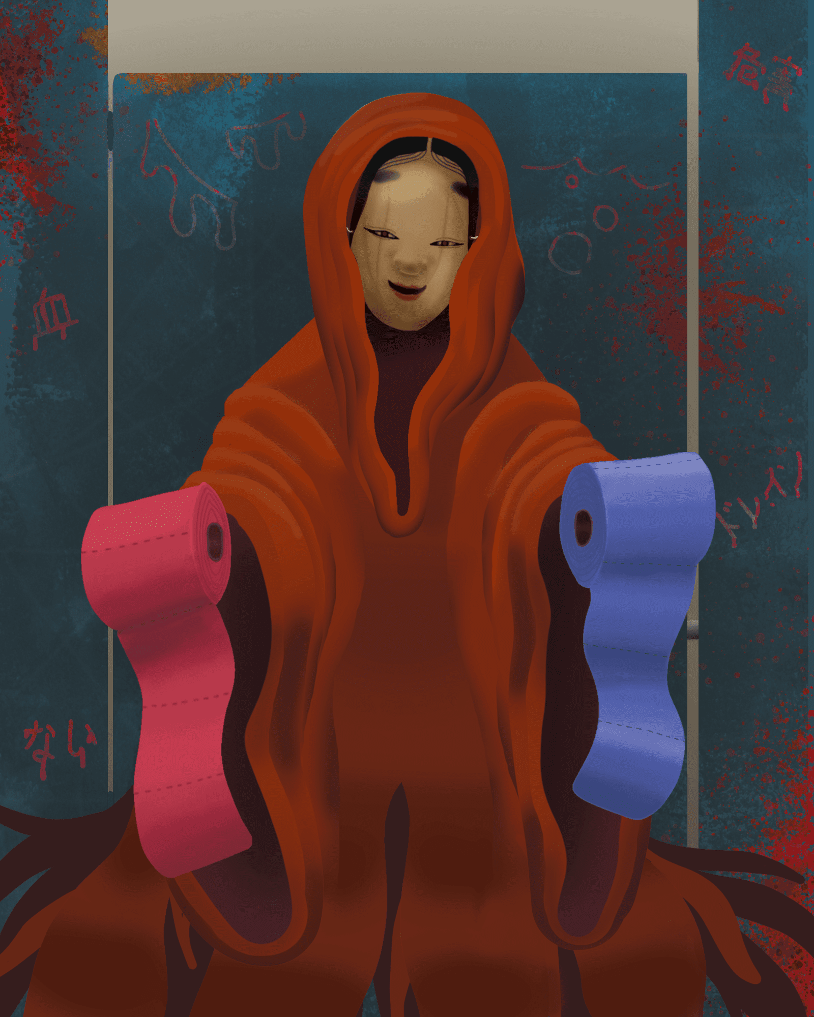 La primera versión dice que morirás si eliges el papel higiénico rojo, mientras que el papel azul significa que vivirás. Otra versión es que elegir el papel rojo hará que te corten el cuello, empapando todo tu cuerpo en sangre. Pero elegir el papel azul significa que toda la sangre de tu cuerpo será succionada, convirtiéndote en un cadáver pálido. En otras palabras, es un escenario en el que perderás sí o sí.