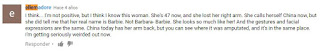 «Creo … No estoy segura, pero creo que conozco a esta mujer. Ella tiene ahora 47, y perdió su brazo derecho. Ella se llama ahora China, pero sí me dijo que su nombre real es Barbie. No Bárbara-Barbie. Ella se parece tanto a ella! Y los gestos y las expresiones faciales son los mismos. China hoy en día tiene su brazo de vuelta, pero se puede ver en donde fue amputada, y está en el mismo lugar. »