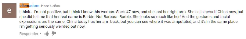 «Creo … No estoy segura, pero creo que conozco a esta mujer. Ella tiene ahora 47, y perdió su brazo derecho. Ella se llama ahora China, pero sí me dijo que su nombre real es Barbie. No Bárbara-Barbie. Ella se parece tanto a ella! Y los gestos y las expresiones faciales son los mismos. China hoy en día tiene su brazo de vuelta, pero se puede ver en donde fue amputada, y está en el mismo lugar. »