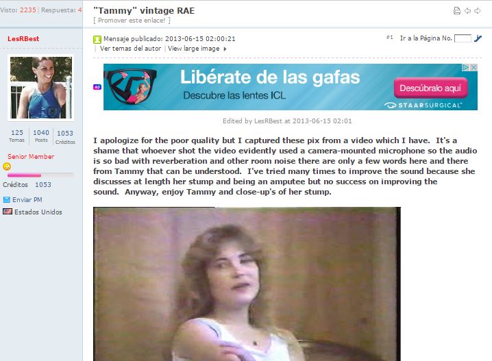 Me disculpo por la mala calidad pero capturé estas pics de un vídeo que tengo. Es una pena que todo el que grabó el video utiliza evidentemente un micrófono de cámara montada de manera que el audio es tan malo con la reverberación y otros ruidos de la habitación. Sólo unas pocas palabras aquí y allá de Tammy que se puedan entender. He intentado muchas veces para mejorar el sonido porque se analiza en profundidad el muñón, pero sin éxito en mejorar el sonido. de todos modos, disfrutar de Tammy y de cerca de su muñón.