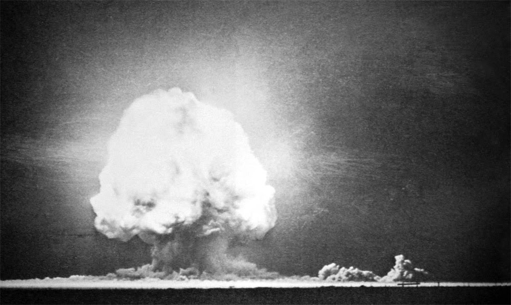 Esta es una de varias famosas fotografías tomadas de la primera detonación nuclear jamás hecha. Llevada a cabo por el ejército de Estados Unidos el 16 de julio de 1945, en el White Sands Proving Ground (ubicado en el desierto, a unos 35 km al sureste de Socorro, Nuevo México). Este artefacto de plutonio (el mismo método utilizado en el dispositivo «Fat Man» lanzada sobre Nagasaki) marcó el comienzo de la Era Atómica y la eventual carrera armamentista entre Estados Unidos y Rusia.