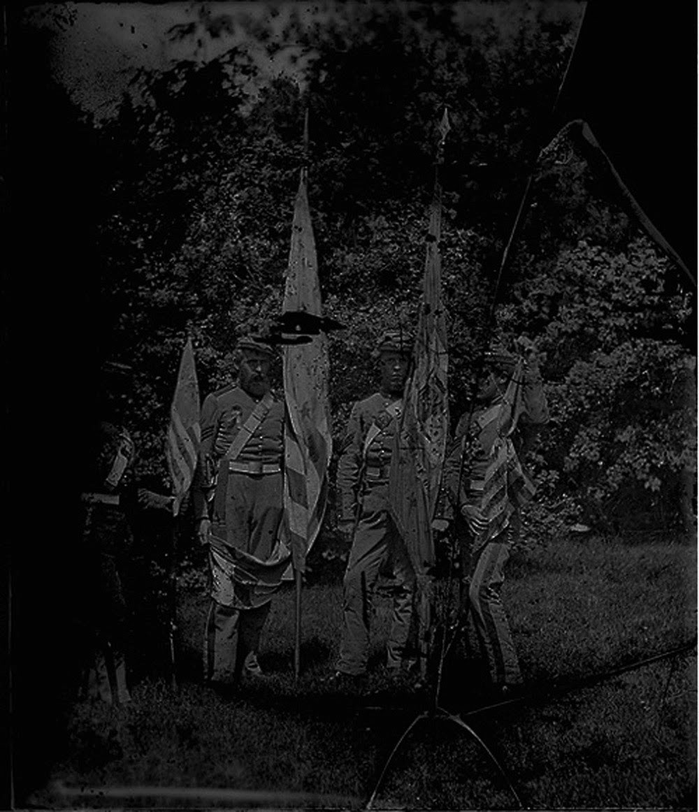Esta fotografía proféticamente desgarrada representa una guardia de honor del regimiento del Ejército de la Unión, un mes antes de que se marcharan a la batalla en Antietam (septiembre de 1862).