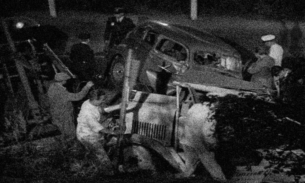 Tammie Harlow sobrevivió, pero los chicos fueron expulsados por el parabrisas y murieron en el acto. Un fotógrafo de la escena del crimen del periódico local tomó esta toma de como un equipo de voluntarios trabajó frenéticamente para liberar a John Downing, el conductor del Chrysler. Al parecer, el pequeño Billy y Stevie estaban mirando lo lejos.