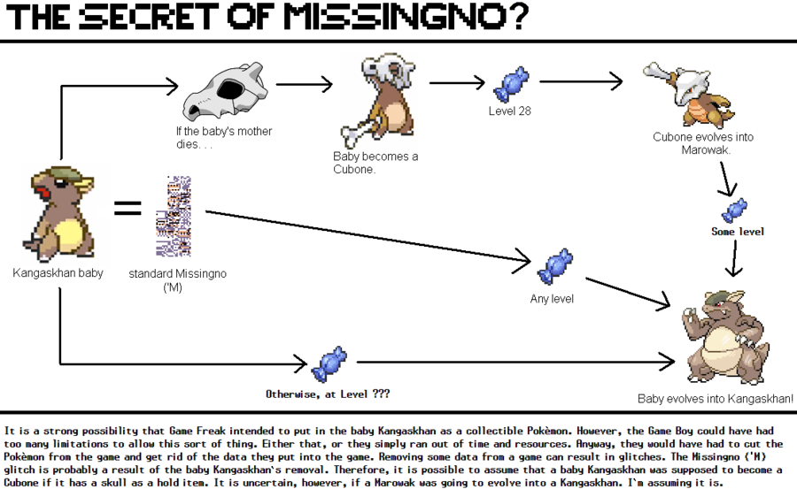 Esto explica el origen de MisingNo pues anteriormente Kanghaskan era la evolucion de Marowak pero al ser removido paso a un espacio vacio (MisingNo) por eso es que al darle un caramelo raro a MisingNo evoluciona a Kanghaskan.