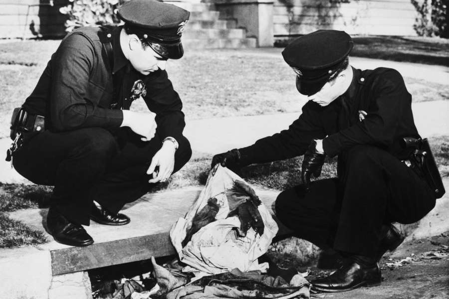 El teniente detective Jesse Haskins describió la condición del cuerpo cuando llegó por primera vez a la escena del crimen. Había una huella de neumático contra el bordillo y había lo que parecía ser una posible marca de tacón con sangre en esa marca de neumático; también había un saco de cemento vacío en el camino de acceso y también tenía una mancha de sangre en él … Lo habían llevado allí desde algún otro lugar … El cuerpo estaba limpio y parecía haber sido lavado. La escena del crimen estaba repleta de reporteros, fotógrafos y una multitud de curiosos.