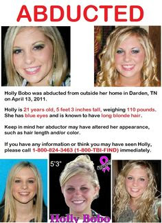 El 13 de abril de 2011, Holly Bobo, de 20 años, desapareció de la casa de su familia en Darden, Tennessee. Esa mañana, Holly, una estudiante de enfermería, se levantó temprano a las 4:30 am para estudiar para un examen. Tres horas más tarde, respondió una llamada de su novio, Drew Scott, que estaba cerca cazando pavos.