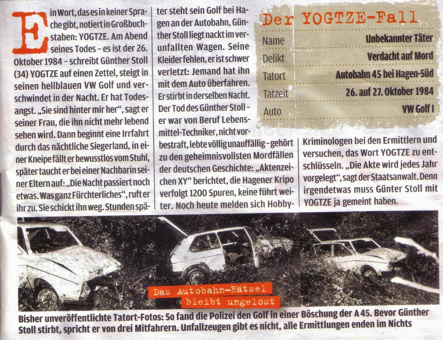 En 1984 un hombre desempleado llamado Günther Stoll (que trabajaba como técnico en la industria alimentaria), de Anzhausen en Alemania está sufriendo de paranoia. De vez en cuando él habla de «ellos», que quieren hacerle daño o matarlo, pero nunca dice que o quienes son «ellos». El 25 de octubre de 1984, alrededor de las 11 de la noche, mientras que su esposa estaba presente, de repente se levanta de su silla y dice: «Jetzt geht mir ein Licht auf!» («¡Ahora lo entiendo!») y anota YOG`TZE (el G podría ser un 6) y se va.