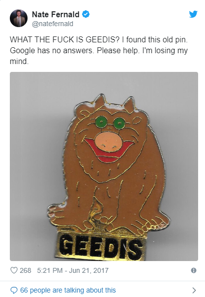 «Estaba buscando un pin de la banda The Jam«, explica el comediante Nate Fernald, autor del tweet anterior y escritor de The Late Late Show con James Corden. “Encontré a este vendedor de eBay que tenía miles y miles de pines de los años 70 y 80. Compré un montón de ellos porque eran viejos y raros y me hacían reír «. Sin embargo uno en concreto le llamó especialmente la atención, dice que encontró el más extraño de todos: un pin a semejanza de un monstruo marrón encorvado con ojos verdes enloquecidos, etiquetados simplemente como «Geedis«. La criatura sonriente tenía el extraño diseño de un personaje medio olvidado, como algo que podrías jurar que recuerdas, pero no puedes dar nada detalles sobre ello. No era reconocible para nadie. Había empezado el misterio de Geedis.