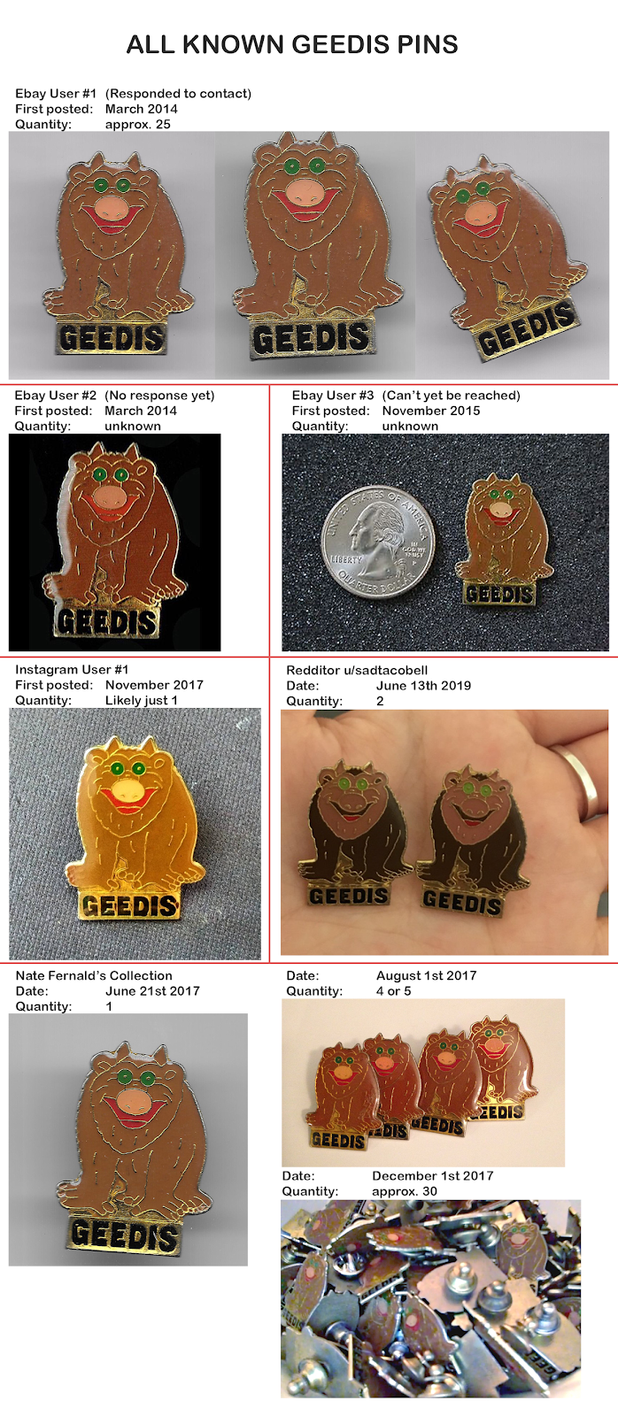 Después de comprar el pin, Fernald contactó con el vendedor para ver si sabían algo más al respecto, pero tampoco tenían información sobre Geedis. Finalmente encontró tres copias más del pin y contactó a los vendedores de cada una. Ninguno de ellos podía hablar de los orígenes de Geedis.