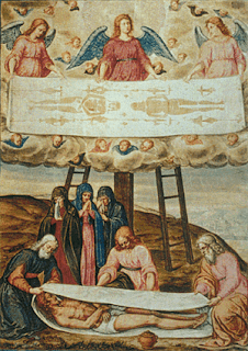 El descenso de la cruz de Giulio Clovio, aquí se muestra como fue usada la sábana santa para envolver el cuerpo de Jesús.