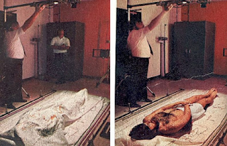 Pero he aquí que hay una variable. Las piernas del cuerpo del sudario estaban dobladas hacia arriba con las rodillas flexionadas. Esta es la conclusión a la que han llegado quienes estudiaron la antropometría del cuerpo del lienzo, y es la posición en la que se muestra el cuerpo tridimensional que acompaña a las copias del sudario cuando están exhibidas (última fotografía de este documento).