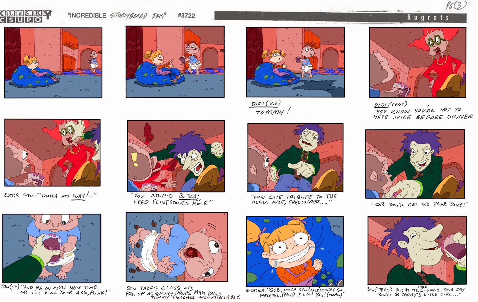 Según los relatos del storyboard, Tommy sufría un ataque epiléptico por la tensión, mientras Angélica mostraba una excitación perturbadora ante la violencia de Stu. Lo que seguía eran escenas de contenido sexual explícito, incesto y pedofilia que escalaron a medida que otros artistas del estudio añadían sus propios dibujos al «jam».