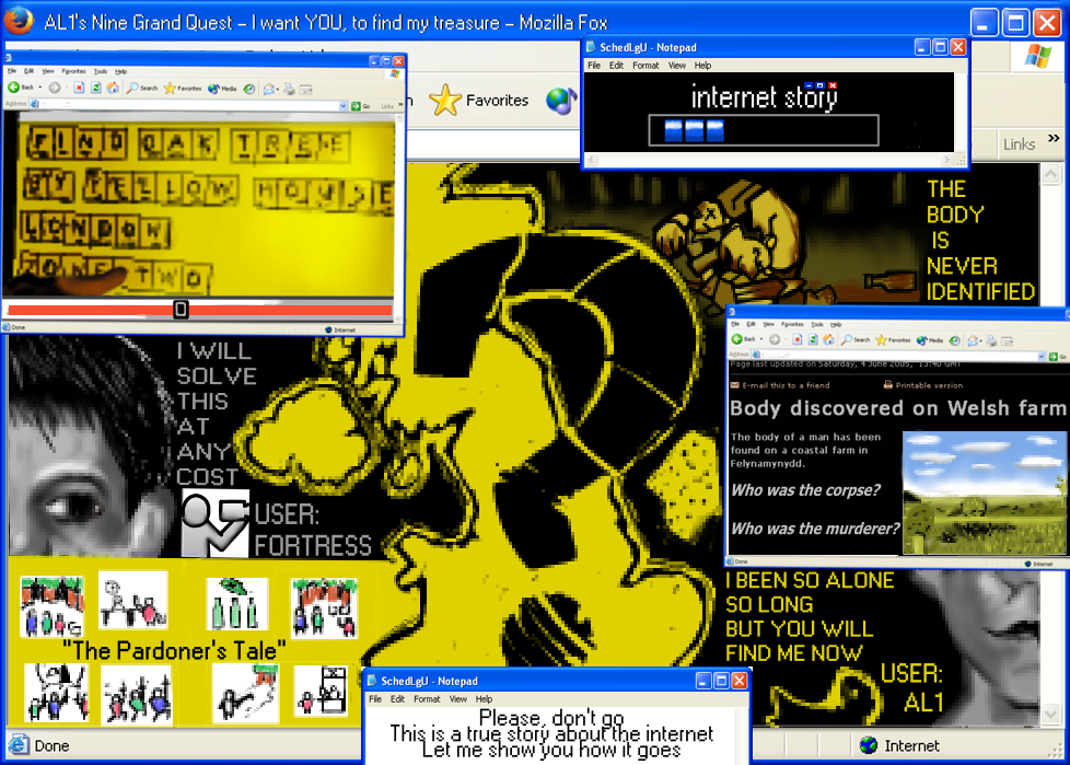 Adam Butcher anunció la producción de Internet Story a través de su sitio web en algún momento en 2009, describiéndola como una historia acerca de un videoblogger en una búsqueda del tesoro, contada a través de vídeos, animaciones, blogs y artículos de noticias. En junio de 2009, Butcher afirmó que encontró un enlace a un sitio web para una búsqueda del tesoro titulado «Nine Grand Quest Al1», que más tarde se reveló que fue creada por él mismo a principios de año. También creó una cuenta de YouTube para Fortress, el blogger de vídeo ficticio en la búsqueda. Internet Story se terminó en abril de 2010 y fue subido a Vimeo el 31 de julio.