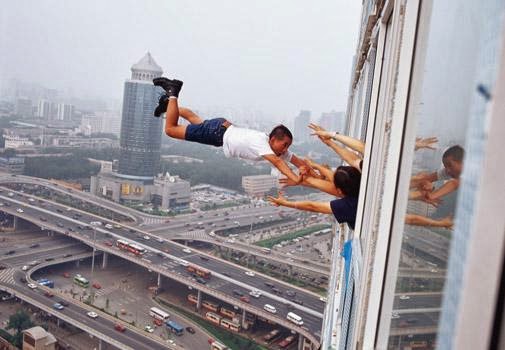 Esta imagen es la obra fotográfica de Li Wei. El cuerpo de Li Wei parece flotar desde una ventana en el piso 29 de un complejo en Pekín. Esto se logró con la ayuda de cables invisibles, espejos y andamios. La fotografía resultante fue retocada para borrar cualquier rastro de la arquitectura en esta puesta en escena.