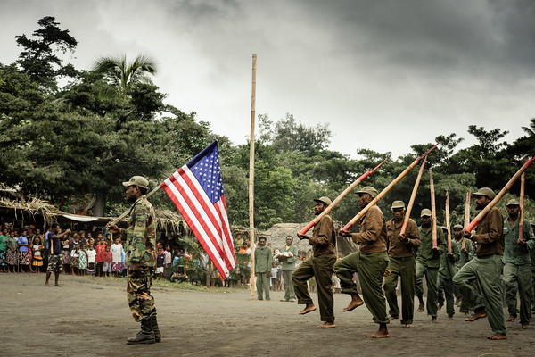 Los aldeanos se visten con calzones caseros del Ejército de los EE.UU., se pintan su bandera en el pecho y la espalda desnuda, y llevan una réplica del ‘Old Glory’ hasta el asta de la bandera junto al emblema del Cuerpo de Marines y la bandera estatal de Georgia. Los soldados descalzos luego marchan a la perfección a la sombra de Yasur, el volcán activo de la isla, con «rifles» de bambú con punta roja a sus hombros.