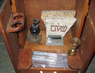 Después de abrir la caja, decidí no pintarla . La limpié y froté un poco de aceite de limón. Fue en ese momento que me di cuenta de que había una inscripción en hebreo tallado en la parte posterior del gabinete . No tengo idea de lo que dice o si es significativo. He incluido una foto de esa inscripción a continuación. El dia del cumpleaños de mi madre , 28 de octubre de 2001, me llamó para decirme que se iba fuera de la ciudad con mi hermana durante tres días, y aplazó la celebración de su cumpleaños hasta que ella volviera . El 31 de octubre de 2001, mi madre vino a mi tienda . Nos íbamos a almorzar juntos, pero antes de salir , le di la caja. A ella parecía gustarle . Mientras lo examinaba , fui a hacer una llamada telefónica . Yo no había estado fuera más de 5 minutos cuando uno de mis empleados vino corriendo a mi oficina diciendo que algo andaba mal con mi madre.