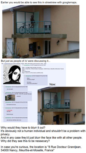 El 10 de diciembre de 2011, un usuario anónimo en 4chan / x / publicó un hilo con indicaciones para encontrar algo curioso en Google Maps. La dirección lleva a una casa residencial en Nancy, Lorraine, Francia. Al usar Google Street View (función 3D), se ve algo «extraño» en un balcón. Se hicieron debates sobre lo que podría ser. Una respuesta aceptada era que se trataba simplemente de un soporte de tabla de surf. Sin embargo, durante el debate, Google Maps censuró la imágen. ¿Por qué Google se censura a menos que fuera algo que ellos querrían mantener oculto?