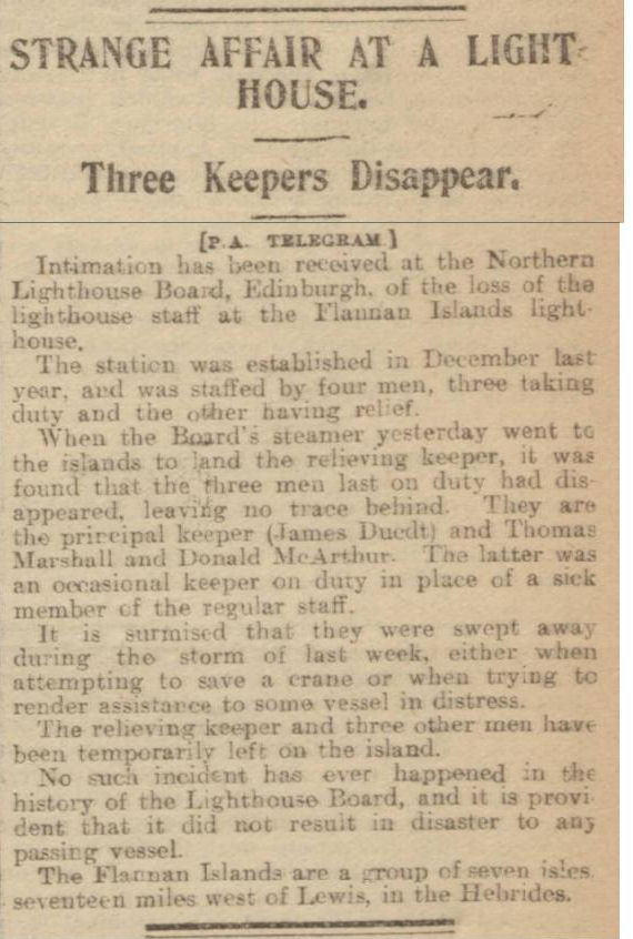 Inmediatamente se envió un telegrama: «Un terrible accidente ha ocurrido en las Flannans. Los tres guardianes: Ducat, Marshall y el ocasional [McArthur] habían desaparecido de la isla. A nuestra llegada esta tarde ningún signo de vida se veía en la isla».