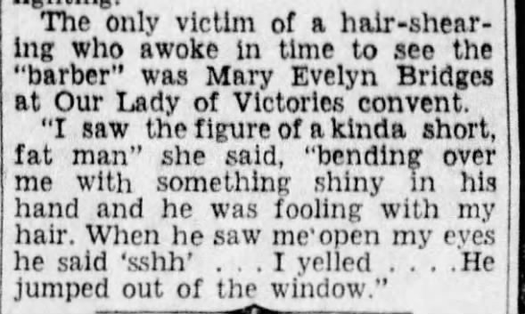 Su reinado de terror comenzó el viernes 5 de junio de 1942, cuando la joven Mary Evelyn Briggs y Edna Marie Hydel en el convento de Nuestra Señora de las Victorias se sorprendieron al encontrar a un hombre saliendo por la ventana de su habitación. Las dos chicas estaban ilesas, aunque a cada una le faltaba un mechón de pelo. Más tarde, Briggs describió al hombre como «algo pequeño, bastante gordo, y llevaba una sudadera blanca».