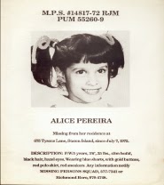 Cuando estaba trabajando como pintor en South Beach de Staten Island, un edificio de apartamentos, una pequeña de cinco años de edad, Alice Pereira (nombrada arriba), desapareció de uno de los pisos en el año 1972, pero los oficiales no contaban con pruebas sólidas necesarias para una acusación.