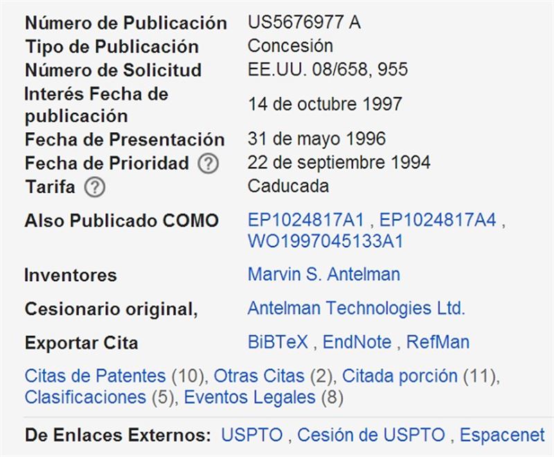 La búsqueda, claro, lleva a una patente expedida por la Oficina de Patentes de los EE.UU. que está siendo difundida como la supuesta cura del sida y que ha dado lugar a numerosas teorías conspirativas.