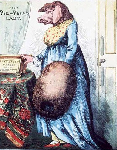 Fue tal la especulación que se empezaron a exhibir «mujeres cerdo» en ferias. En el siglo XIX, los espectáculos freak y las atracciones de carnaval eran enormes en el Reino Unido y en el continente en general. Explotaban enormemente a las personas con discapacidad y generalmente eran engaños gigantes. Hubo una atracción, sin embargo, que era un elemento básico de los espectáculos de monstruos, llamado «The Pig-Faced Lady» (la mujer con cara de cerdo). Era sencillo, pagabas tu precio de entrada y entrarías a ver lo que claramente era una mujer corpulenta con la cara de un cerdo.