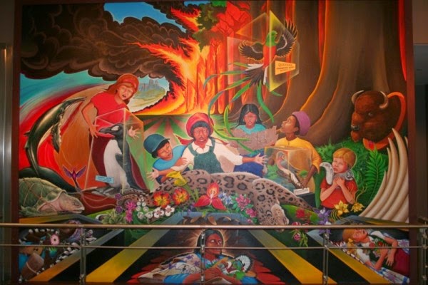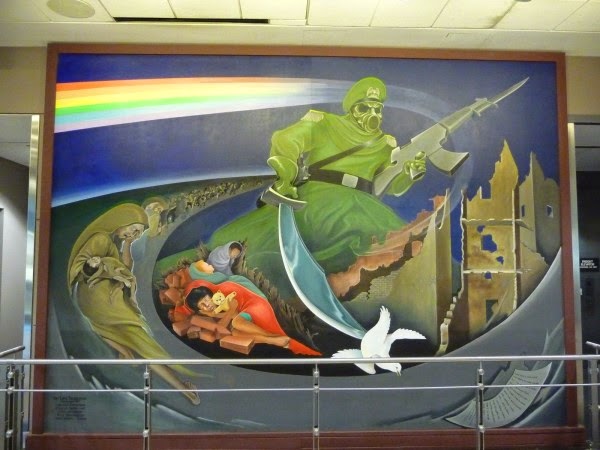 Otras cosas que llaman la atención de su interior son los murales. Pueden parecer algo abstractos, pero contienen mucha simbología. El sitio web oficial del aeropuerto dice que el nombre del siguiente mural se llama «Paz y Armonía con la Naturaleza». En el centro de la pieza, vemos unos entristecidos niños con especies animales y vegetales extintas. En el fondo, un bosque en llamas y más atrás, una ciudad en llamas. Parece rodeada por una neblina de color enfermo, como si hubiera sido atacada por un arma bio-química.