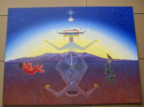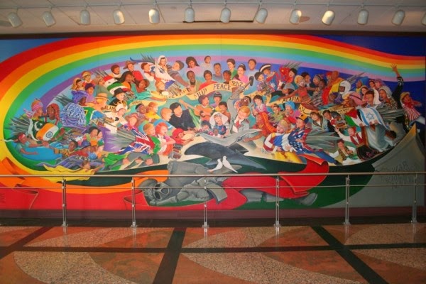 Este mural es llamado “The Children of the World Dream of Peace”, y fue creado por Leo Tanguma. Supuestamente este mural expresa el deseo de abolir la violencia en la sociedad, niños de todas partes de mundo celebrando la paz que prevalece sobre la guerra. Dichos niños del mundo aparentemente están entregando armas, envueltas en banderas de distintos países, a un niño alemán que se encuentra en el centro. ¿Por qué un niño alemán? Hay tantas alusiones a Alemania y el nazismo en este aeropuerto que no hay manera de que puede ser una coincidencia.