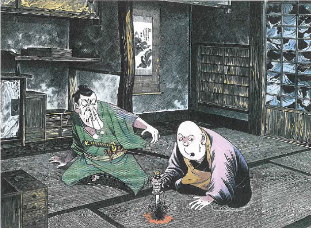 Con la llegada del alba, la casa se asentó y el temblor terminó. Kido no debía ser derrotado tan fácilmente, y decidió continuar su estancia en la casa. La segunda noche fue idéntica a la primera. El día transcurrió sin incidentes, pero por la noche la casa se sacudió. Kido tuvo suficiente de la casa y fue a pedir consejo a un amigo lejano, un monje llamado Chisen, que vivía en un templo en una aldea cercana. Chisen escuchó su historia con calma, pensó por un momento y le dijo a Kido que lo acompañaría a la casa y se quedaría a pasar la noche con él. La tercera noche fue una repetición de la primera y la segunda, un día aburrido y una noche con temblores. Con la casa haciendo todo lo posible para desalojar a Kido y Chisen, o al menos para aplastarlos contra algo, Chisen se sentó tranquilamente en el centro de la sala principal como si estuviera meditando. Se quedó mirando fijamente al suelo durante horas como buscando algo, ajeno al caos que lo rodeaba. De repente, en un rápido movimiento, Chisen desenfundó la espada corta de Kido, que había metido en su faja de obi, y la hundió en un lugar particular en el suelo de tatami. En el instante en que Chisen apuñaló ese punto del suelo, la casa dejó de temblar. La sangre brotó del lugar que Chinsen había apuñalado.