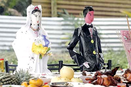En la tradición china, un matrimonio de fantasmas es un matrimonio en el que han fallecido una o ambas partes. Otras formas de matrimonio fantasma se practicaron en todo el mundo, de Sudán pasando por Francia. Los orígenes de matrimonio de fantasmas chinos son en gran parte desconocidos, los informes de que se practican hoy en día se puede encontrar, y aunque ilegal, se sigue practicando.