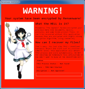 Rensenware es un troyano ransomware en Microsoft Windows. Muestra una imagen de Minamitsu Murasa, que es un artwork oficial del juego Touhou 12 y un mensaje que le dice al usuario que juegue Touhou 12: Unidentified Fantastic Object.