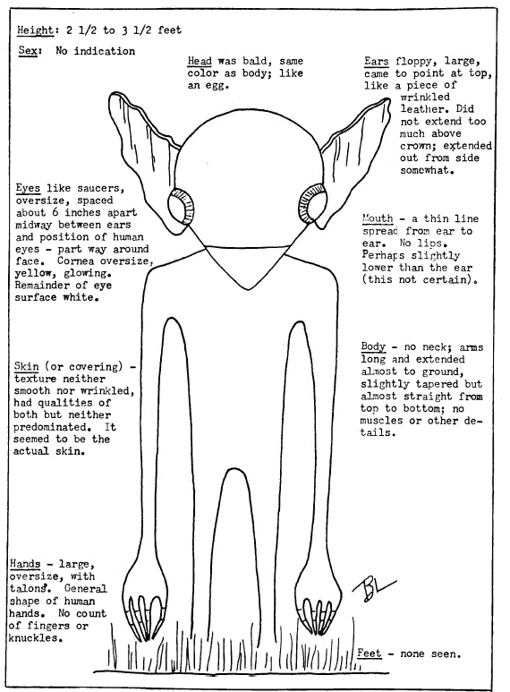 Las siete personas presentes en la granja afirmaron que estaban aterrorizadas por un número desconocido de criaturas similares a los gremlins, que desde entonces se han referido a menudo como los «Duendes de Hopkinsville» en la cultura popular. Los residentes de la granja los describieron como de aproximadamente tres pies de altura, con orejas erguidas y puntiagudas, extremidades delgadas (se decía que sus piernas estaban casi en un estado de atrofia), brazos largos y manos o garras como garras. Las criaturas eran de color plateado o vestían algo metálico. Sus movimientos en ocasiones parecían desafiar la gravedad con ellos flotando sobre el suelo y apareciendo en lugares altos, y «caminaban» con un movimiento de balanceo.