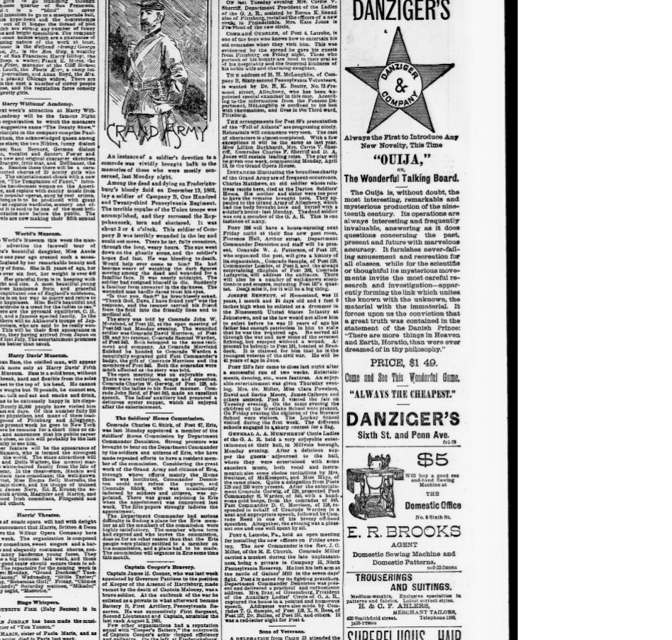En febrero de 1891, los primeros anuncios comenzaron a aparecer en los periódicos: «Ouija, the Wonderful Talking Board». La lanzó una tienda de juguetes y novedades de Pittsburgh, describiendo un dispositivo mágico que responde a preguntas «sobre el pasado, el presente y el futuro con una precisión maravillosa», y prometió «una diversión y una recreación sin fin para todos», un vínculo «entre lo conocido y lo desconocido, lo material y lo inmaterial». Otro anuncio en un periódico de Nueva York lo declaró «interesante y misterioso».