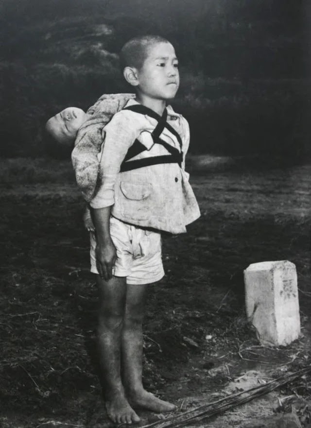 Esta fotografía fue tomada por un fotoperiodista estadounidense, Joe O’Donnell, en Nagasaki en 1945. Recientemente habló con un entrevistador japonés sobre esta imagen: «Vi pasar a un niño de unos diez años. Llevaba un bebé a la espalda. En esos días en Japón, a menudo veíamos niños jugando con sus hermanos o hermanas pequeños sobre sus espaldas, pero este niño era claramente diferente. No llevaba zapatos. Su rostro era duro. La cabecita estaba inclinada hacia atrás como si el bebé estuviera profundamente dormido. El niño se quedó allí durante cinco o diez minutos. Los hombres con máscaras blancas se acercaron a él y en silencio comenzaron a quitarle la cuerda que sostenía al bebé. Fue entonces cuando vi que el bebé ya estaba muerto. Los hombres sujetaron el cuerpo por las manos y los pies y lo echaron al fuego. El niño se quedó allí derecho sin moverse, (observando las llamas). Se mordía el labio inferior con tanta fuerza que brillaba con sangre. La llama ardió como el sol, se dio la vuelta y se alejó en silencio. «