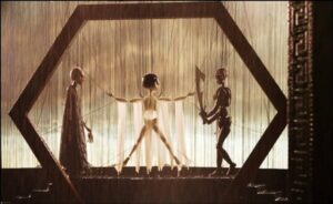 Es sumamente extraña: en lugar de dar a luz a un bebé, este es tallado como una escultura de madera hasta que nuevas cuerdas luminosas descienden del cielo y se insertan en él.