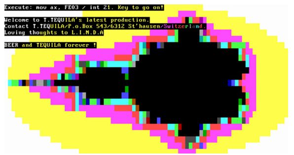 Bienvenido a la última producción de T.TEQUILA. Póngase en contacto con T.TEQUILA PoBox 543/6312 St’hausen / Suiza Pensamientos amorosos a L.I.N.D.A CERVEZA y TEQUILA para siempre! Ejecute: mov ax, FE03 / int 21. ¡Pulse cualquier tecla para continuar!