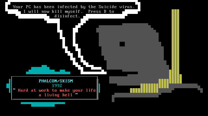 «Su PC ha sido infectado por el virus suicida. Ahora me suicidaré. Presione D para desinfectar PHALCON / SKISM 1992 Trabajando duro para hacer tu vida un infierno viviente».