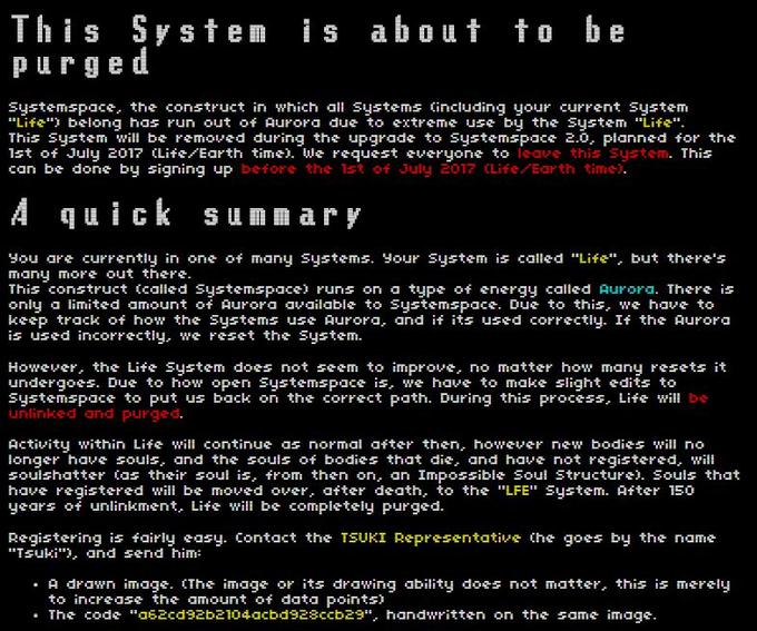 Un curioso mensaje que habla de algo denominado «espacio de sistemas (systemspace)», que vendría a ser una especie de mundo multidimensional, y de que actualmente estamos en un sistema llamado «Vida», y que si se suicida antes de una fecha concreta comenzará la «destrucción de la vida».