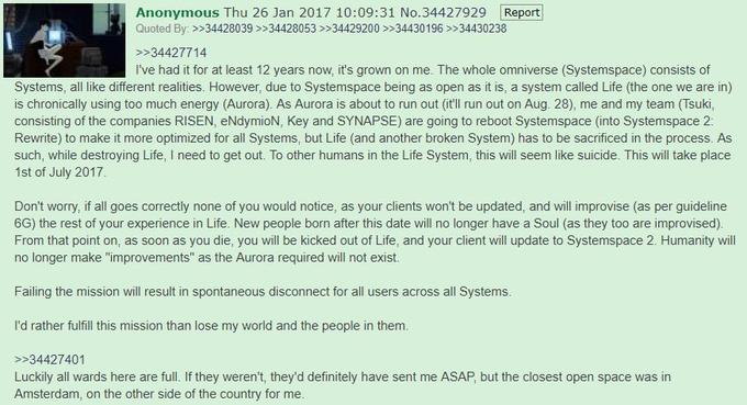 Esto de por sí es bastante raro, y parece que pasó bastante desapercibido, hasta que el 26 de enero de 2017, un usuario anónimo de 4chan envió un hilo a / r9k / afirmando tener «un segundo mundo» en su cabeza, y que los humanos del «sistema» residen en el «omniverso» conocido como «espacio de sistema», cuya energía, «Aurora», está desbordada. Por ello en el futuro inminente, habría la necesidad de crear un «Sistema de espacio 2».