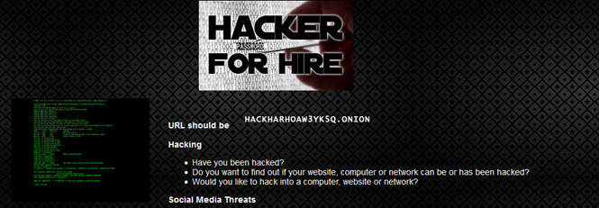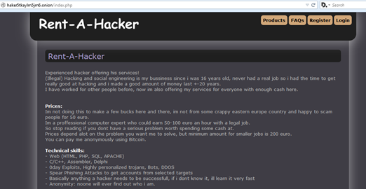 Desde la propia Hidden Wiki se puede acceder a «Rent-A-Hacker», una web donde un informático europeo que dice tener veinte años de experiencia en ingeniería social y hackeos ilegales se ofrece para realizar ataques DDoS, exploits de día-cero, troyanos «altamente personalizados» y phishing de todo tipo. El importe mínimo por un trabajo menor era de 200 euros, a partir de ahí todo lo que quisieras.