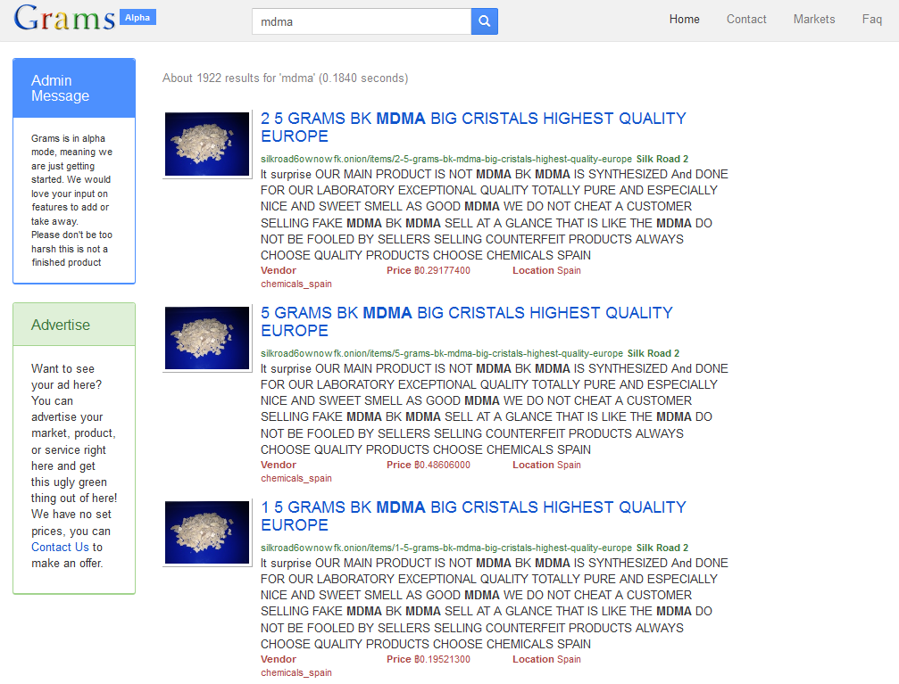 Grams es algo diferente, es un buscador de productos cuyo algoritmo integra varios criptomercados de droga; es decir, si buscas cannabis te lo encuentra en las diferentes tiendas de la deep web. Además ordena por popularidad.