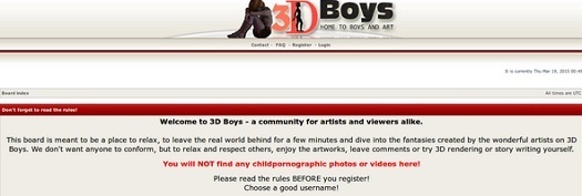 Foros conocidos son «3DBoys», aunque como nombré más arriba, no hay verdadera pornografía aquí, pues es perseguida, solo historias que crean las mentes retorcidas de sus usuarios y mucho arte erótico.